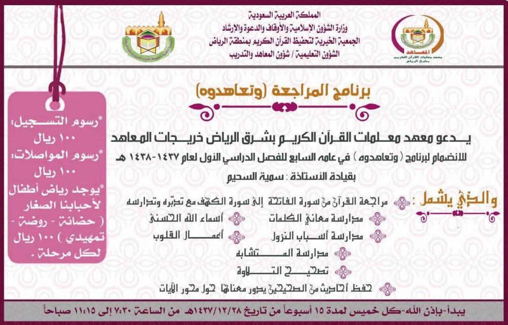 الحمد لله رب العالمين و صل اللهم و سلم على رسول الله . برنامج المراجعة " و تعاهدوه " الذي سيكون في مدينة الرياض " معهد معلمات القرآن الكريم بشرق الرياض" بإذن الله ؛ و لتفاصيل أخرى بالصورة .. [sor2]http://www.t-elm.net/moltaqa/attachment.php?attachmentid=11030&stc=1&d=1475190113[/sor2]