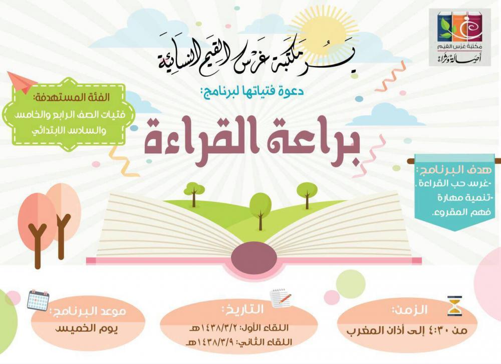 الحمد لله رب العالمين و صل اللهم و سلم على النبي الأمين. برنامج ( براعة القراءة ) لفتيات جدّة ~ التواقيت ستكون بإذن الله كما في الصورة . الموقع: جدة - مؤسسة غرس القيم النسائية حي الرحاب(4) شارع حزم الجلاميد . |